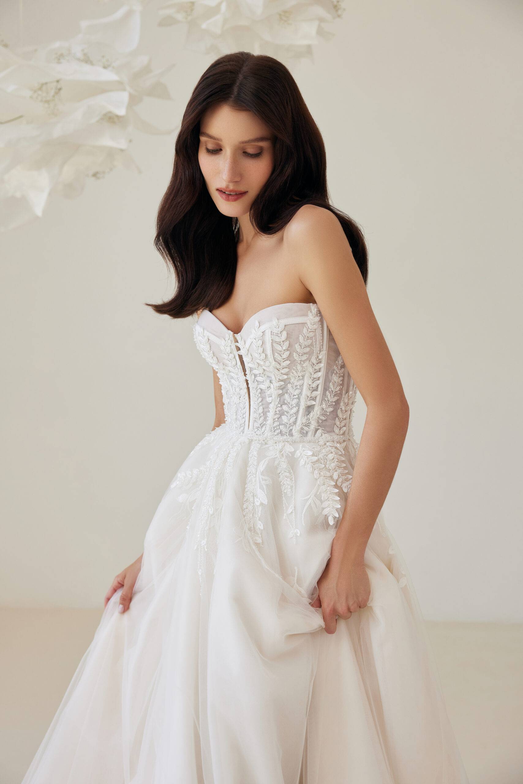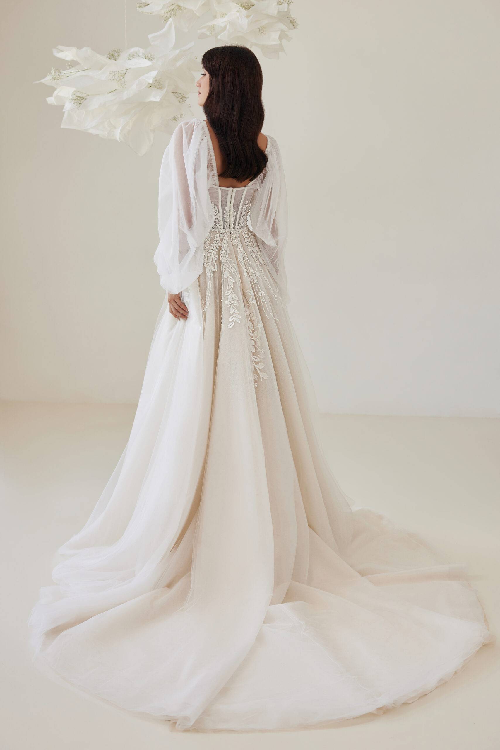 Korzetový střih krásně zvýrazňuje pas a díky propracovanému vnitřnímu zpevnění šaty dokonale sedí po celý den. Odnímatelná vlečka (2 m) umožňuje snadno měnit vzhled šatů mezi obřadem a večerní zábavou.